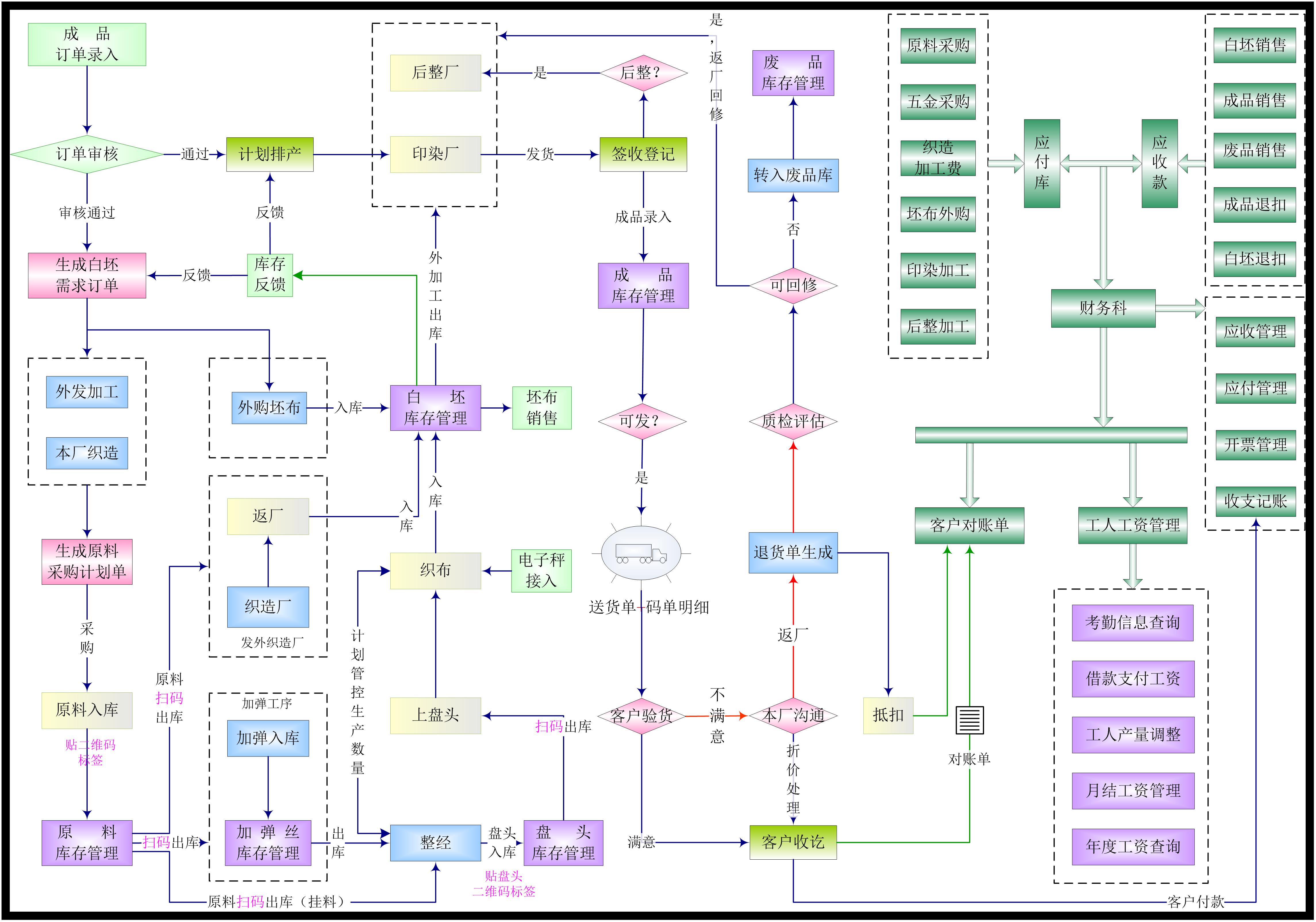 财务部可对客户及供货商的应收款、应付款、收支记账、开票信息,以及织造工人工资进行管理,同时支持原料厂、织造厂、印染厂、后整厂、客户的对账单生成及打印,便于快速跟客户进行对账。 ERP涵盖了生产的方方面面,从成品订单到原料采购到坯布生产,发外加工,再到财务管理,通过这一系列的流程,领导可以快速掌握成品订单的整个流程,不仅提高效率,提高数据的准确性,更降低了对人员的依赖,也为生产管理提供了强大的数据保证,为企业的长远发展奠定了坚实的基础。